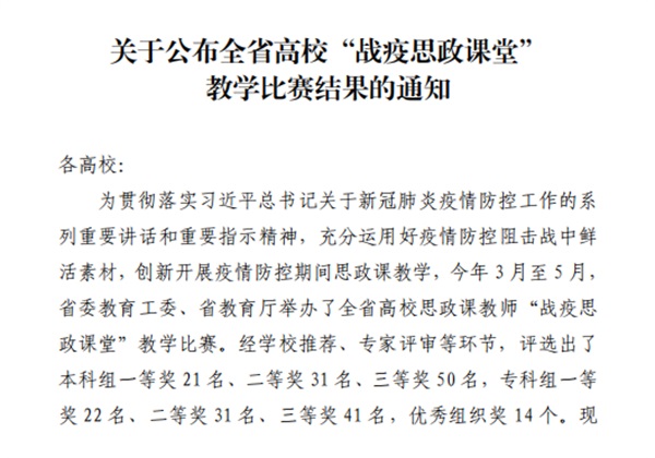 此次参赛获奖为我校进一步提高思政理论课教学水平起到了良好的示范作用,为我校思想政治理论课建设提供了有益方向。学校将继续紧紧围绕习近平新时代中国特色社会主义思想,深入贯彻落实习近平总书记在学校思想政治理论课教师座谈会上的讲话精神和习近平总书记关于新冠肺炎疫情防控工作的重要指示精神,以“战疫思政课堂”教学比赛为契机,加强我校思政课教师队伍建设,打造我校思政课精品课程,推动课程思政落实落地,创新思政课堂教学,不断提升我校思政课的思想性、理论性和亲和力、针对性。(供稿单位:高职学院 责任编辑:罗楚颖)