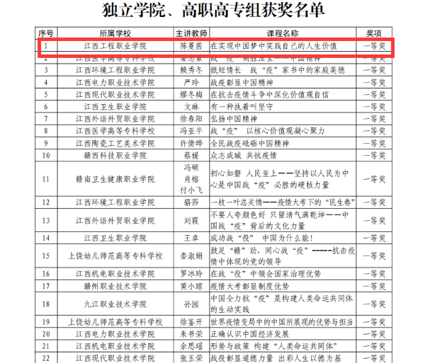 近日,江西省教育工委、省教育厅下发《关于公布全省高校“战疫思政课堂”教学比赛结果的通知》,我校高职学院教师陈蔓茜的教学课程《在实现中国梦中实践自己的人生价值》从全省比赛提交的373件参赛作品中脱颖而出,荣获高职高专组一等奖第一名。