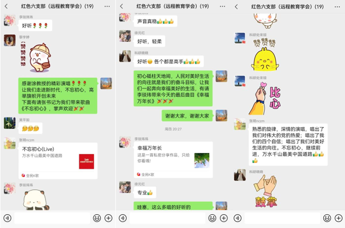 “熟悉的旋律,深情的演唱,唱出了我们对伟大的党的热爱;唱出了我们的‘四个自信’;唱出了我们对美好生活的向往。不忘初心、继续前进,万水千山最美中国道路。”七首经典红歌演唱结束后,支部书记张明在支部微信群里热情地赞叹道。