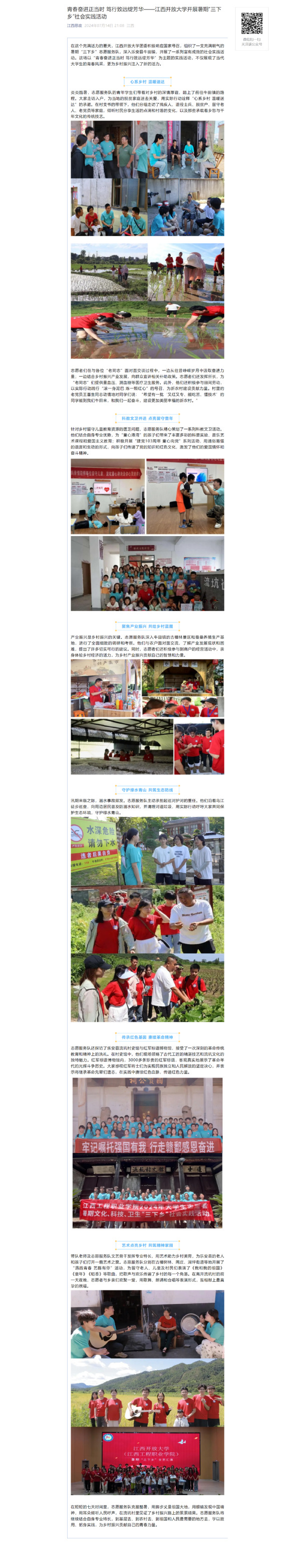 在这个充满活力的夏天,球王会体育团委积极响应国家号召,组织了一支充满朝气的暑期“三下乡”志愿服务队,深入乐安县牛田镇,开展了一系列富有成效的社会实践活动。这场以“青春奋进正当时 笃行致远绽芳华”为主题的实践活动,不仅展现了当代大学生的青春风采,更为乡村振兴注入了新的活力。