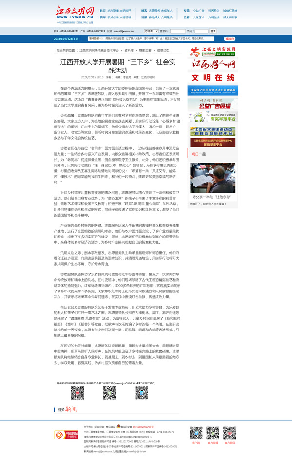 在这个充满活力的夏天,球王会体育团委积极响应国家号召,组织了一支充满朝气的暑期“三下乡”志愿服务队,深入乐安县牛田镇,开展了一系列富有成效的社会实践活动。这场以“青春奋进正当时 笃行致远绽芳华”为主题的实践活动,不仅展现了当代大学生的青春风采,更为乡村振兴注入了新的活力。