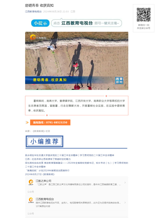 暑假期间,南昌大学、景德镇学院、球王会体育、南昌职业大学等高校的大学生志愿者顶高温,冒酷暑,行走在赣鄱大地,开展暑期社会实践,在实践中磨砺青春,收获真知。原文地址:https://mp.weixin.qq.com/s?__biz=MzA4NjQyNTEzNw==&mid=2649799838&idx=2&sn=35a9e04244b98060fa9c43a48d120280&chksm=86be1bf27fcf7b57800e5e5768cfe0e22493e67cfbd301a01ed1288b8dd7170e699298440a70&mpshare=1&scene=23&srcid=0829lYY6c1igVHiOZIrEYXRz&sharer_shareinfo=07721cd08d1d7121c9a9c980d166c117&sharer_shareinfo_first=b0bcc2d21ac1571902586375e668c06a#rd (责任编辑:罗楚颖)