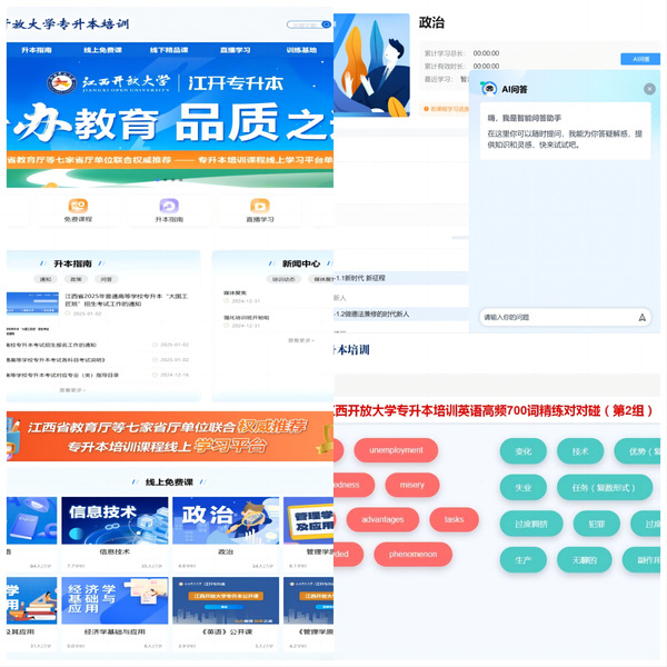 作为江西省教育厅等七家省厅联合推荐的专升本线上培训平台,球王会体育精心打造了集课程学习、专升本资讯、公益讲座、模拟练习等功能于一体的一站式智慧学习平台。平台通过AI智能助教在线答疑、个性化资源推荐、趣味性PK刷题等多项智能化服务,为学员提供个性化的学习支持。同时,平台与江西省终身学习网资源库深度对接,汇聚全省优质师资力量,为全省考生提供高质量的免费精品课程资源。