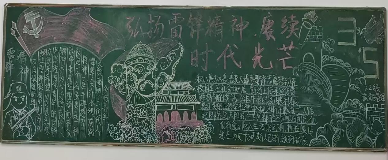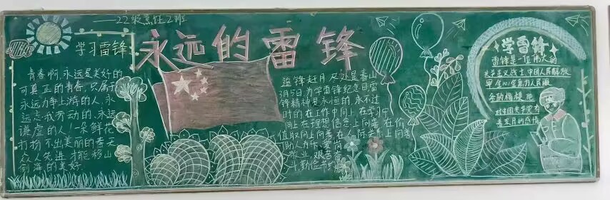 活动中,各班积极参与,精心设计,通过各种信息渠道搜集、了解有关雷锋的助人事迹和奉献名言,将雷锋的故事提炼出来,一笔一划呈现在黑板报上,认真地书写着同学们对雷锋同志的敬仰之情和时代丰碑。其中22级旅游管理、22级烹饪工艺与营养2班板报较为出色。