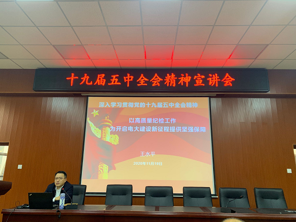 1119日下午,校党委委员、纪委书记王水平以《以高质量纪检工作为开启电大建设新征程提供坚强保障》为题,在高职学院学术报告厅宣讲党的十九届五中全会精神。高职学院党委副书记汪荣林,高职学院纪委委员、各支部纪检委员、全体辅导员、部分教师代表和学生代表参加宣讲会。宣讲会由高职学院党委委员、纪委书记钟宁主持。