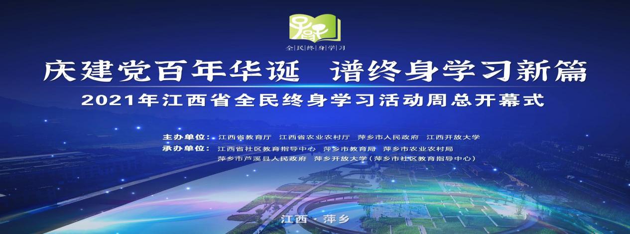 为学习贯彻习近平总书记关于教育的重要论述和视察江西重要讲话精神,推动实现“构建服务全民终身学习的教育体系”“建设高质量教育体系”“建设学习型社会”“建成教育强国”等奋斗目标,12月17日,2021年江西省全民终身学习活动周总开幕式在萍乡市举行。省委副书记、代省长叶建春对推进全省全民终身学习提出要求。省委教育工委副书记、省教育厅厅长郭杰忠宣布2021年江西省全民终身学习活动周启动并讲话,萍乡市委副书记、市长刘烁致辞,校党委副书记、校长黄平槐宣读2021年全国及全省“百姓学习之星”“终身学习品牌项目”表彰决定,省委教育工委委员、省教育厅副厅长裴鸿卫主持会议。
